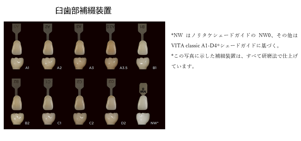「カタナ® ジルコニア ONE」For IMPLANTは、研磨法で仕上げる臼歯部の補綴装置として使用する場合、シェードガイドに適合するように設計されています。臼歯部補綴装置では研磨法による仕上げを、