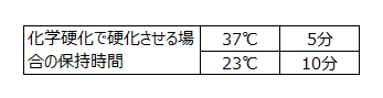 さらに、下表を参考に保持し、セメント内部を化学硬化させます。(マージン部は、光照射の代わりに表面硬化保護材を適用して硬化させることも可能です。)